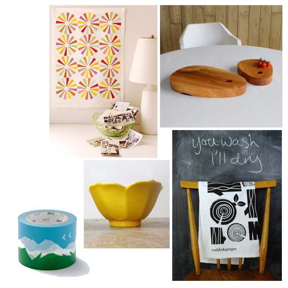 Mountain kitchen lust: (clockwise from the top left) spirals tea towel (http://etsy.me/Pe9S3j), by Avril Loreti, wooden chunky chopping boards (http://etsy.me/UOSFQk) by kattybarac – I especially love how these look like cartoon slabs of ham! Log pile tea towel (http://etsy.me/QRAIBW) by roddy&ginger, gorgeous vintage yellow lotus bowl on etsy (http://etsy.me/PwpP6E) by RustBeltThreads, and finally, what every mountain kitchen needs – mountain washi tape (http://etsy.me/PfQcuJ) by muupygame.