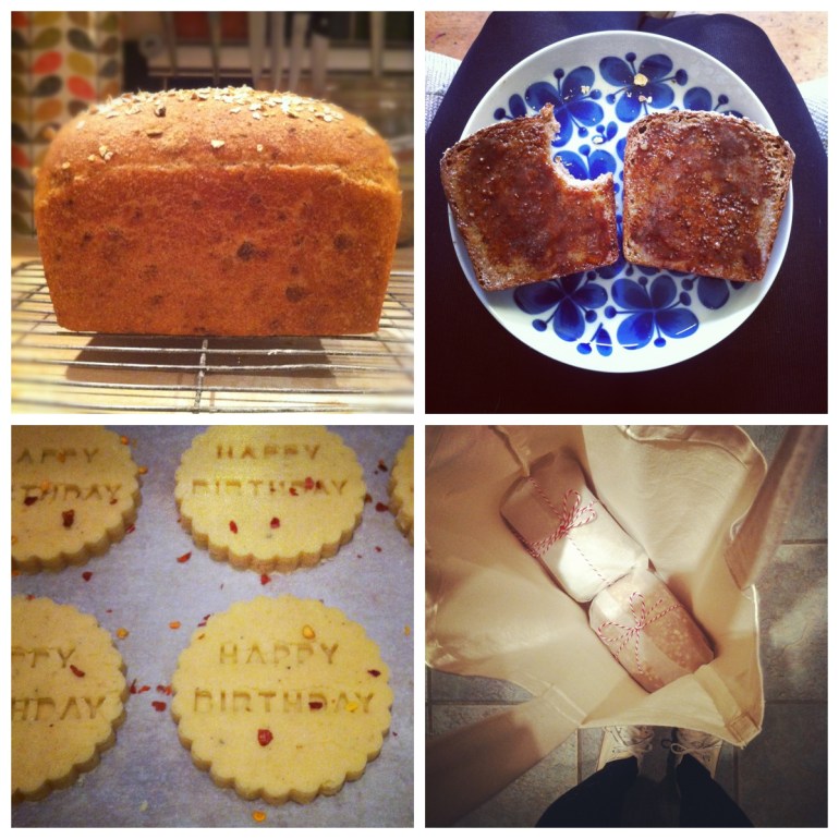 Here are a few instagram shots from last week including my latest creation, the malted wholemeal loaf with oats, some ‘happy birthday’ cheese, garlic and chilli biscuits and my delivery tote bag all loaded up with freshly baked bread.