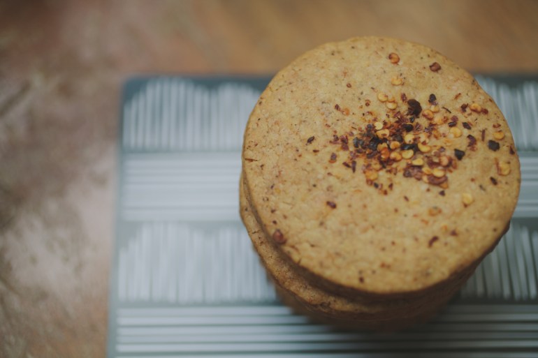 Use a round cutter (or use a knife to cut squares instead) and transfer the cookies to a baking tray, keeping at least 2cm between each one. If you like a little extra kick, sprinkle the tops with additional chilli flakes and a scant shake of sea salt for good measure.