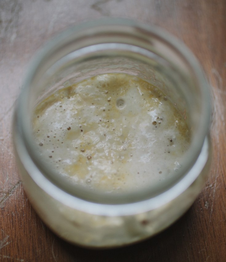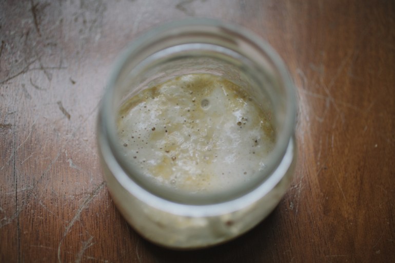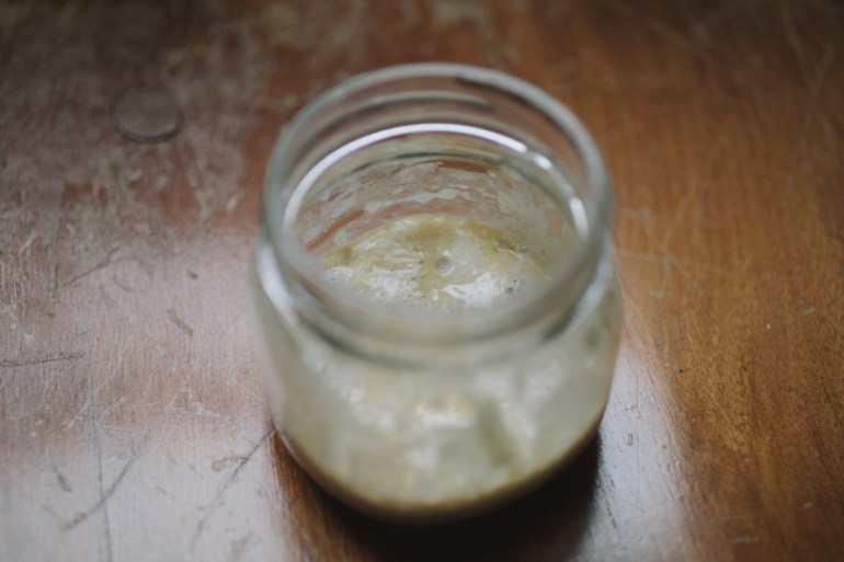 When the aroma is pungent and acidic, and everything is bubbling away, the next thing to do is to feed your culture with fresh supplies. To do this, throw away just over 50% of the mixture and replace it with a handful of fresh flour (for me this is about 25g) and an equal measure of water. Stir to make a gloopy paste and leave again on the countertop, covered up.