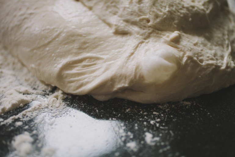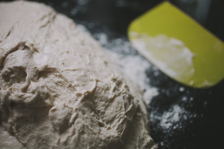 In the morning, you should be greeted with a frothy, bubbling, happy culture. Remember to reserve one tablespoons worth of the culture at this stage, as this will be your starter going forward. To the rest of the mixture, add 550ml of water first, and use your hand to break down the culture, sloshing everything around and making sure that it’s all away from the sides of the bowl. Then add the remaining 850g flour and give it a quick rough mix, before covering the bowl and leaving for about 45 minutes to stand.