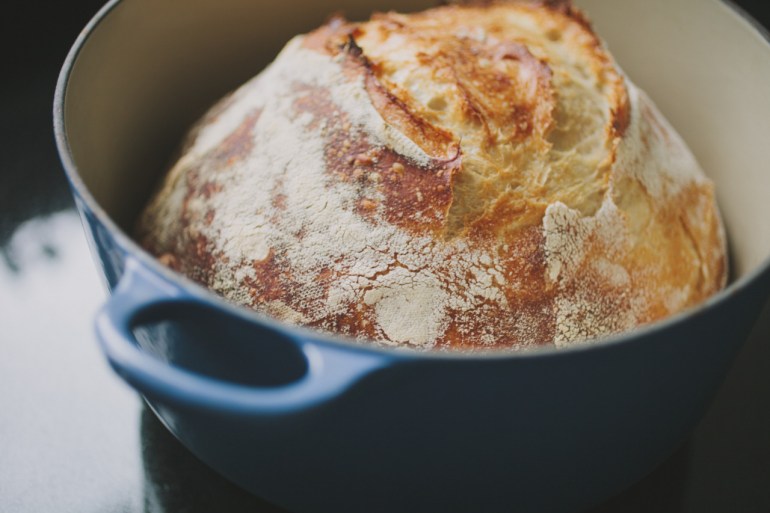 After 30 minutes, take the lid off the casserole dish and let the bread cook for an additional 15-20 minutes depending on how dark you like your crust.