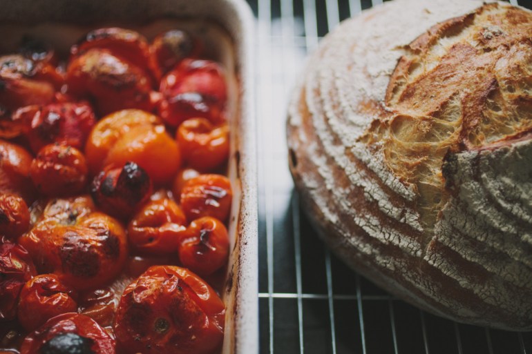 To accompany my bread, I made my colourful roasted tomato soup, which I was able to cook at the same time as the loaf.