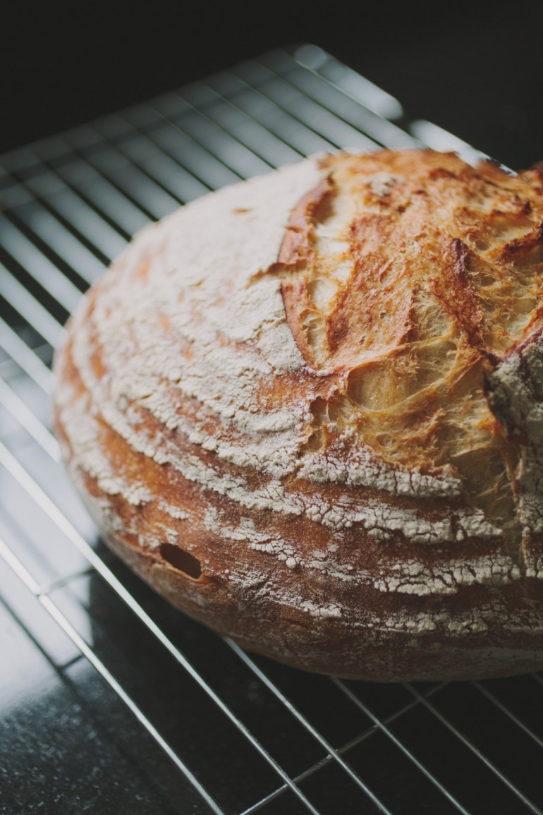 The recipe actually makes two loaves, which is more economical and will also make you popular with your friends, or in my case in-laws. If, however, you don’t feel like sharing then it does freeze really well too. You can see the distinction in the two loves that I baked, as one I proofed in a traditional cane banneton and the other in a cloth lined bowl. To be perfectly honest, the flavour is not impaired at all by using just a regular bowl, lined with a tea towel, so I’d recommend trying that first before investing in a banneton as they can be expensive.