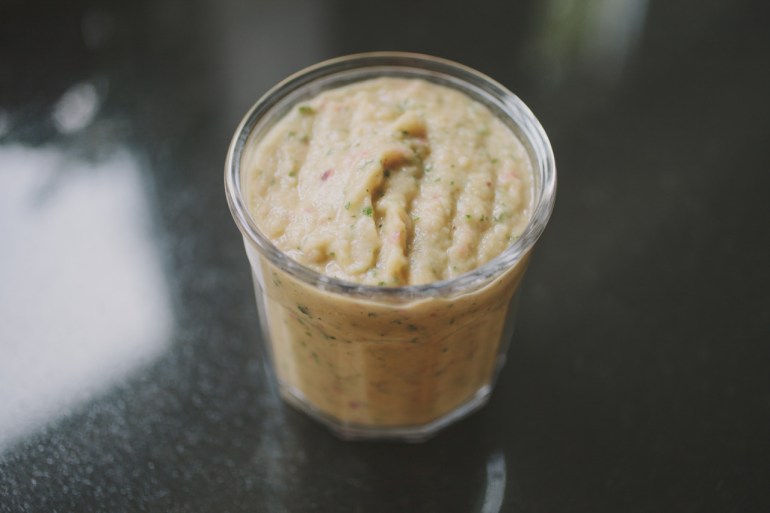 Add finely chopped onion, garlic and parsley and pound again, adding the olive oil a little at a time until all incorporated. Note: you can also use a hand blender if you like a smoother consistency.