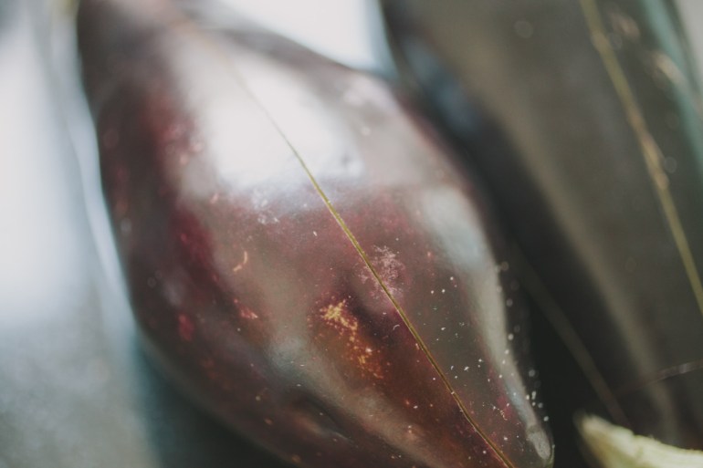 Pre-heat your grill as hot as you can get it. Take both aubergines and score the skin, being careful not to cut too deep, this will allow them to be peeled later.