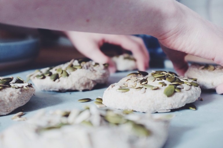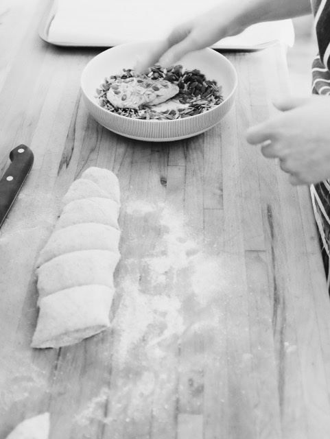 When doubled, take the dough back out of the bowl and roll it into a tight sausage shape. Pour the seeds into a bowl and give them a mix through with your fingers. Use a knife to slice small (3cm) pieces of the dough sausage and roll the cut sides, AKA the wet sides, in seeds.