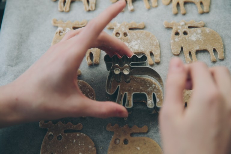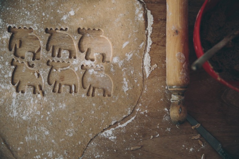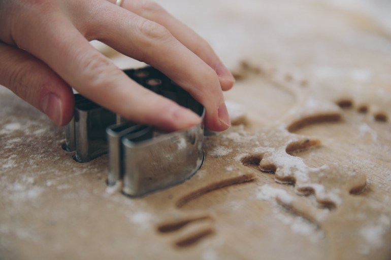 When ready to bake, preheat the oven to 200 degrees c. On a floured surface, roll out the dough as thin as you possibly can. You’re aiming to get it like tracing paper if you can! Use a cutter to punch out shapes and transfer them to a baking tray prepared with greaseproof paper. If you choose to use a fiddly shape cutter, like me, then you might need to use a blunt knife to tease the dough out of the mould.