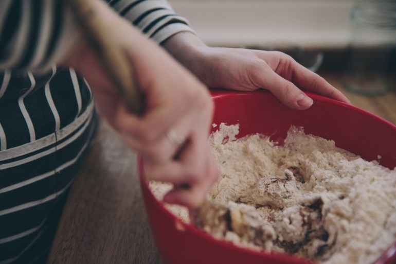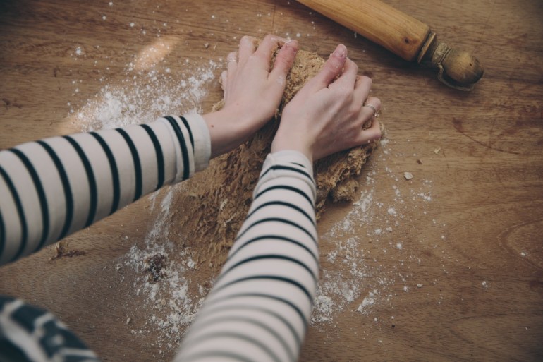 Stir in the water and flour and bring everything together into a shaggy dough. At this point, it’s easier to turn it out onto the countertop and knead it with your hands. A lightly floured surface will stop the dough from sticking.