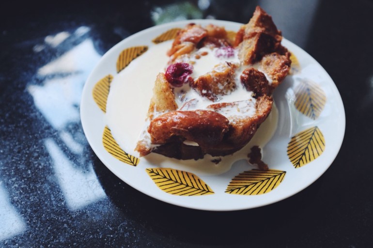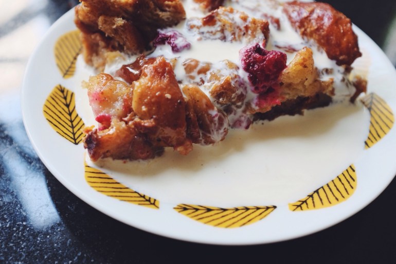 Butter a casserole dish, and tip in the bun/custard mixture. As an extra step here, I made sure to try and get more attractive pieces with twists in the dough facing upwards, but this was purely for aesthetic reasons. Dot the top of the pudding with the raspberries, making sure to spread them out evenly.