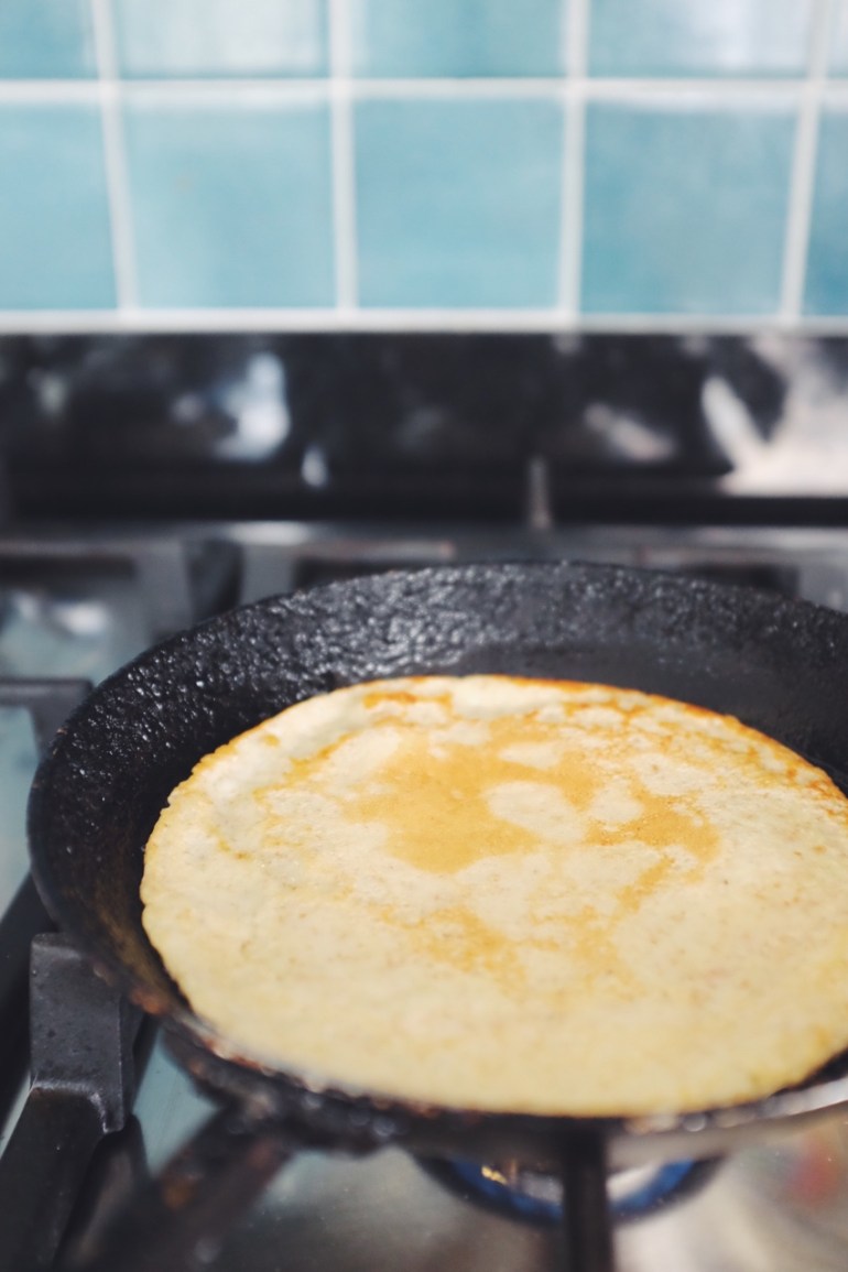 (Open a window!) Heat a seasoned pan on the hob. Give it a little lick of sunflower oil, and let it sit on the stove until starting to smoke a touch. Use a mug or a ladle to measure out a uniform quantity of batter, and add it to the pan. It should immediately bubble, showing that the pan is hot enough. Rotate the pan to spread it out evenly, and let it cook until the batter is no-longer visibly raw in the middle. Use a spatula to flip it over to cook the other side. You can get athletic here if you want to show off your flipping skills, but personally, I never risk it.